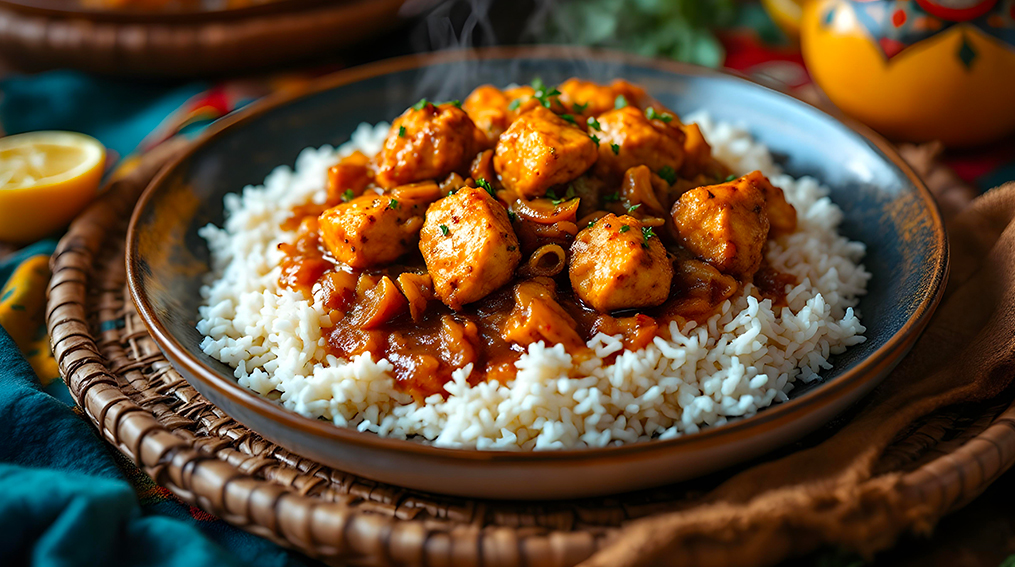 Pollo marinato e cotto con cipolle, aglio e succo di limone, tipico del Senegal, dal gusto intenso e leggermente acidulo.